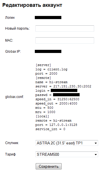 Далее копируем следующие параметры globax: логин, пароль, IP и MAC адреса (которые необходимо прописать в свойствах нашей спутниковой карты):