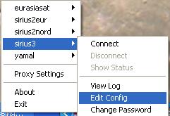 IP-адреса серверов Sirius изменились . Для смены IP нажимаем правую кнопку на ярлыке OpenVpn > выбираем спутник > и Edit Config